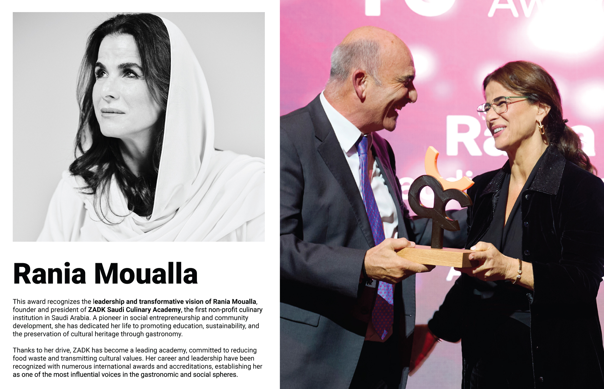 - • رانية يونس معلا، مؤسِّس ورئيس مجلس أدارة أكاديمية زادك السعودية لفنون الطهي، تقديرًا لدورها الريادي في تمكين الشباب السعودي، والحفاظ على التراث الغذائي الوطني، وتعزيز الاستدامة عبر التعليم والتدريب في قطاع الطهي